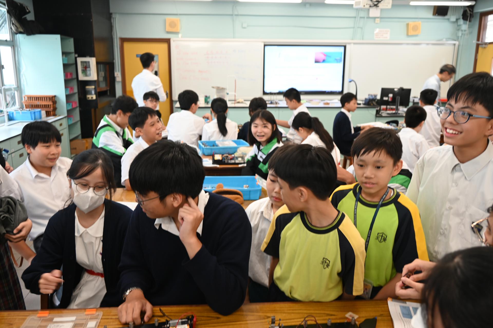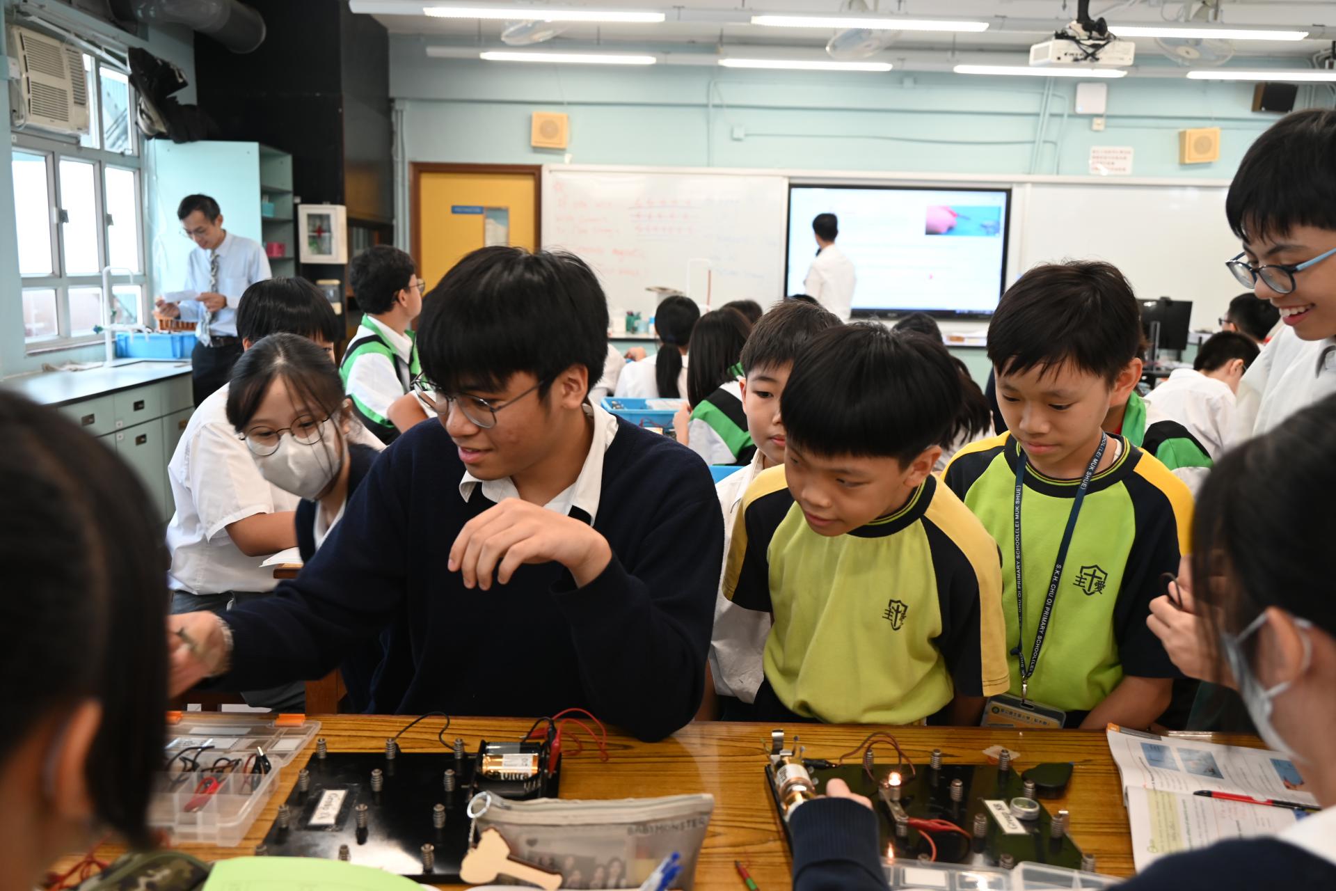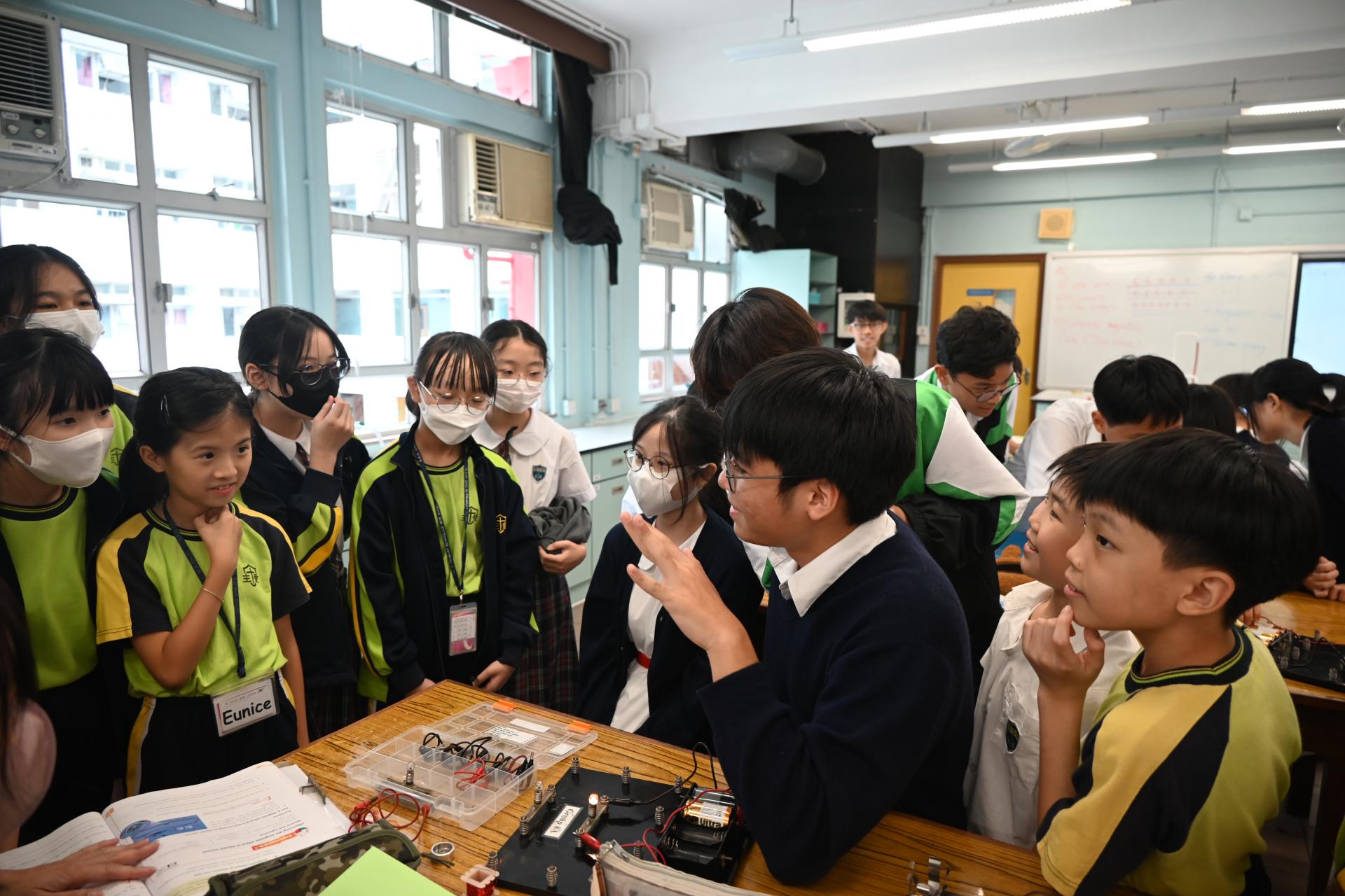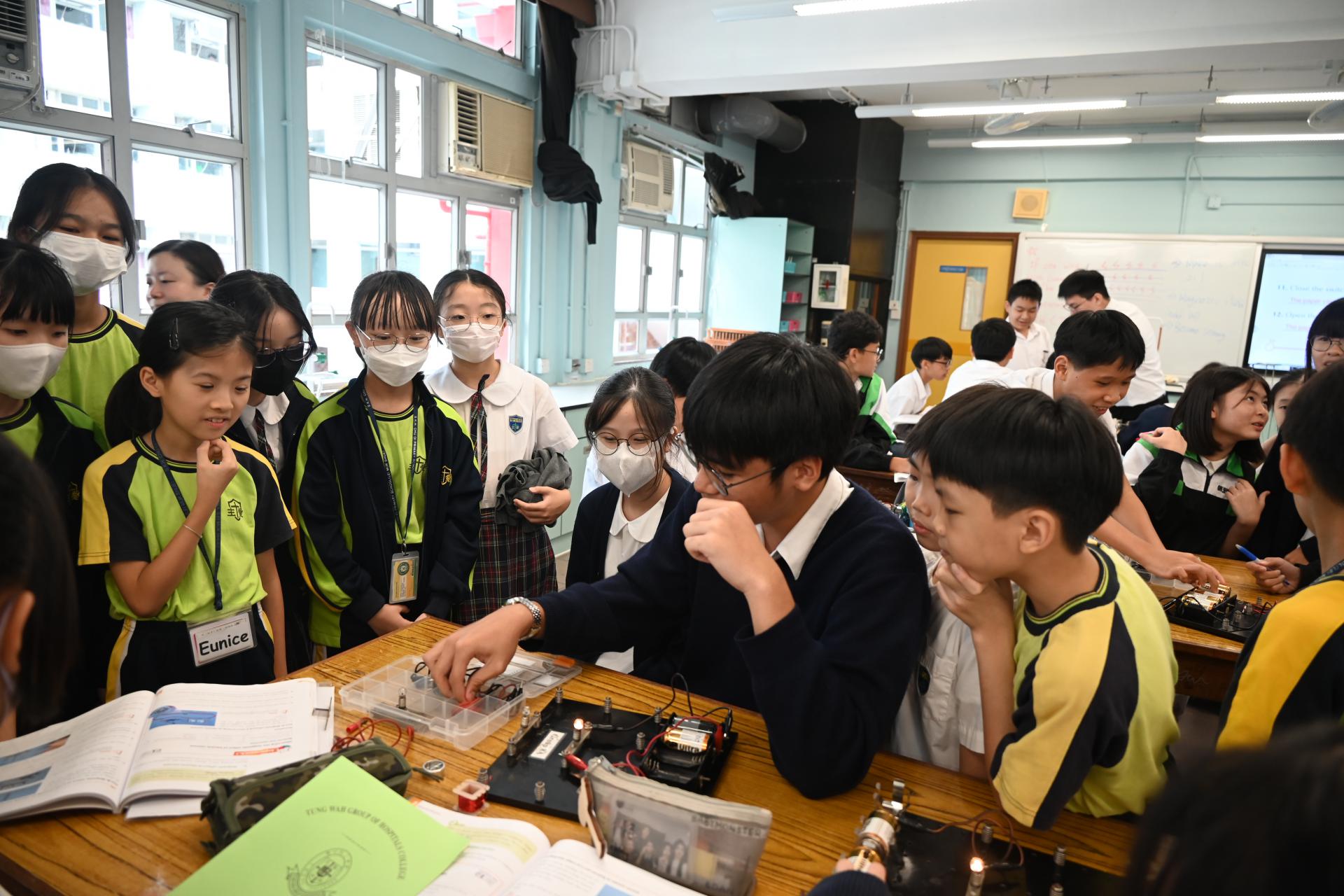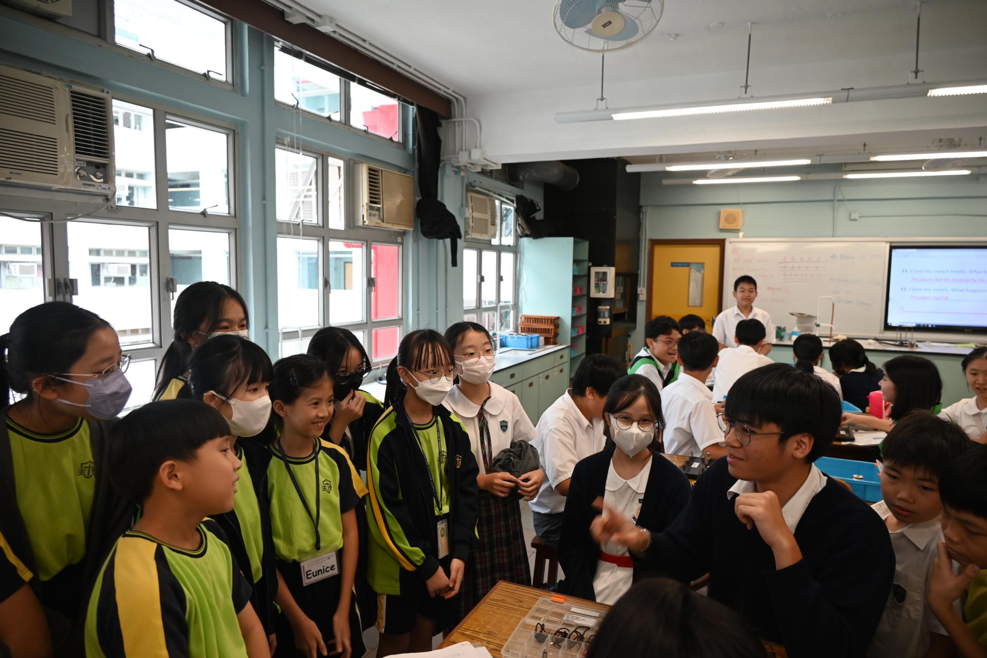 科學實驗室配備先進器材,推動科學探究與創新學習,本校同學更熱情指導同學操作實驗的技巧;參觀期間,大家一同觀摩了有趣的科學實驗,包括電路的物理現象展示。同學在科學堂上 不僅學習了理論知識,更動手操作實驗儀器,提升了觀察及解難能力。