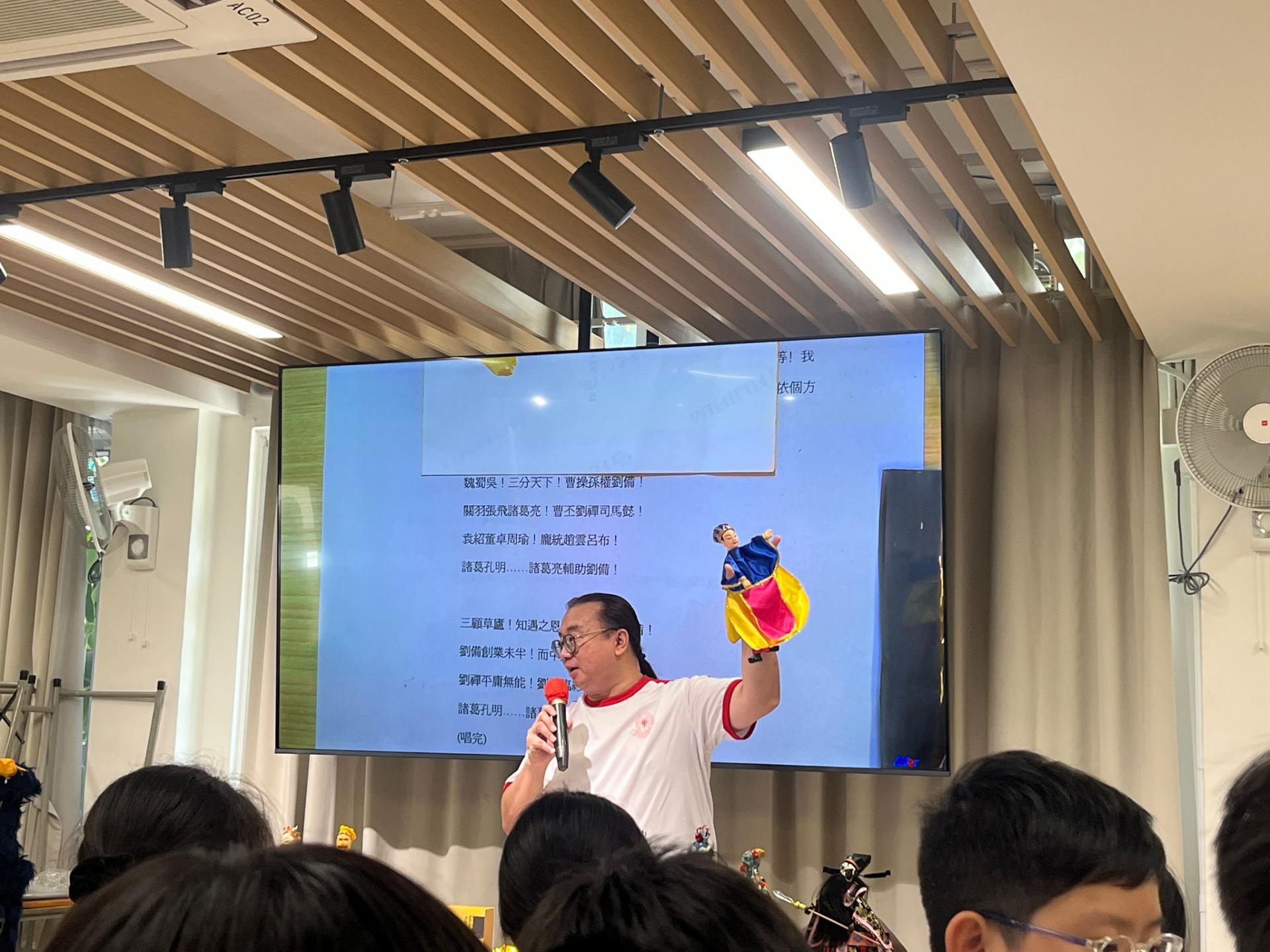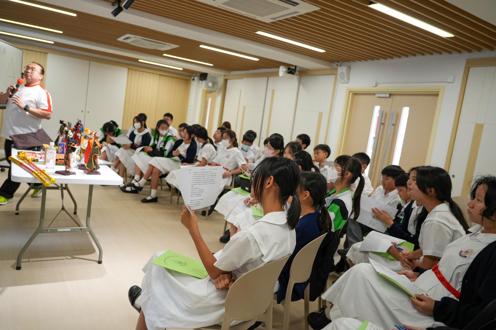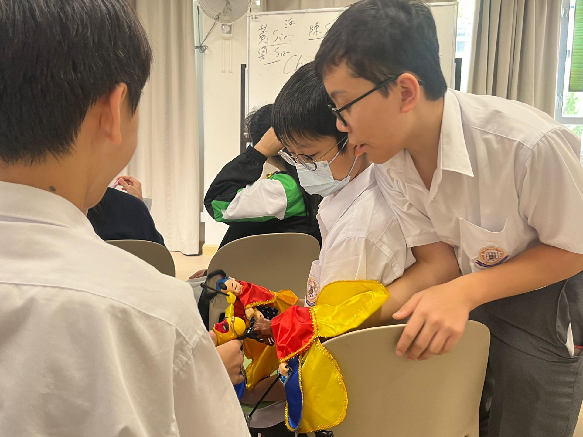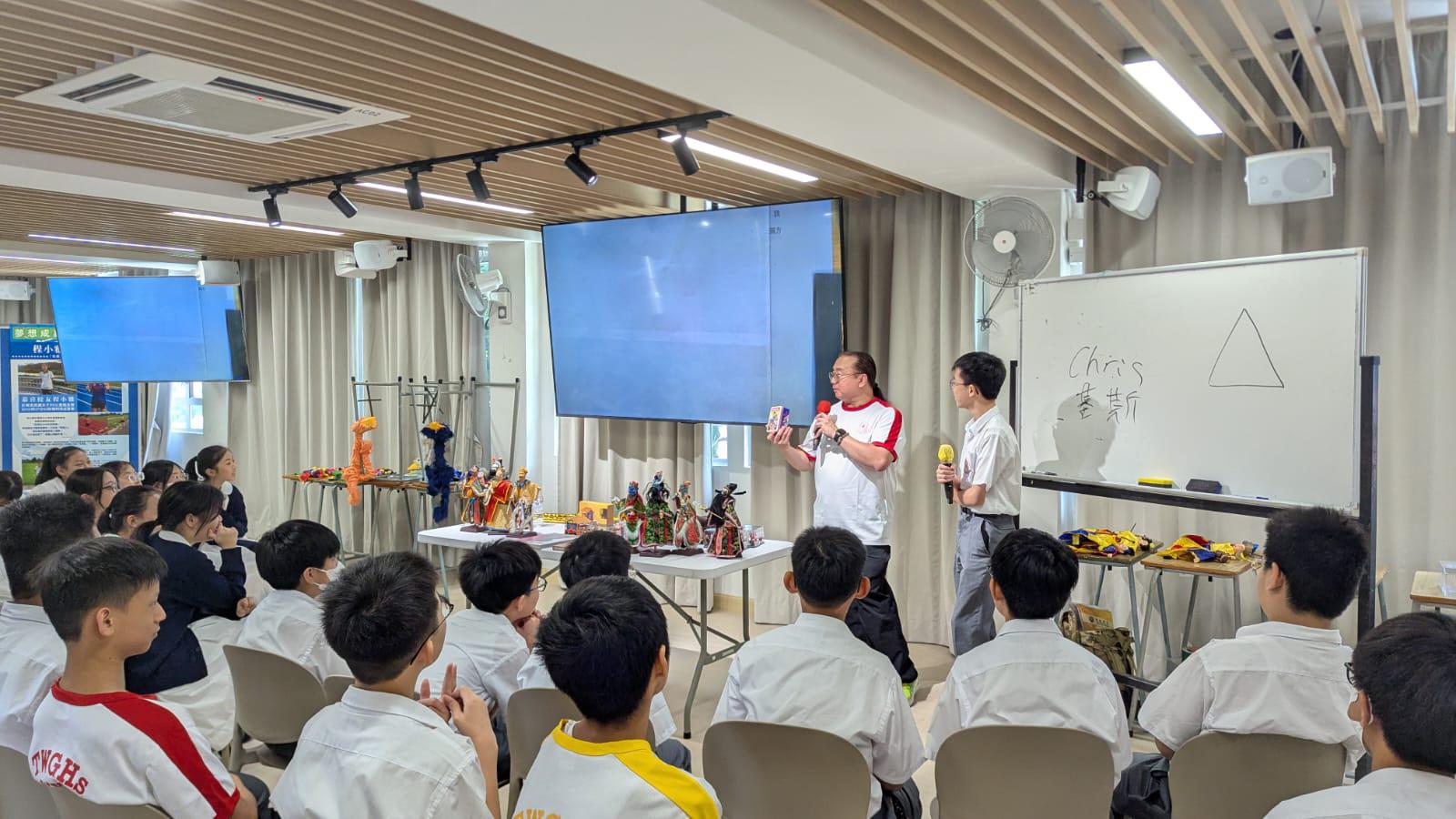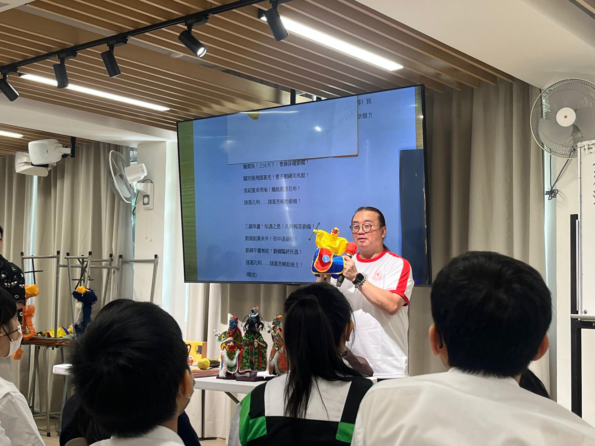 本校家長校董及家長教師會執委陳兆聰先生於9月26日蒞臨本校,與中文科及圖書館合辦「布袋木偶*劇藝課節」,以封神演義、三國演義及西遊記等布袋偶作為引子,藉著互動教育形式,引導同學從時,地,人,事中攝取學習重點及特點,增進吸收知識的效應。 為提高同學學習動機、鼓勵同學自主學習、並增加同學認識傳統文化的機會,陳先生運用表演藝術(肢體/語言表達)、心理學/行為學(內省心理測驗/人物言行分析)、音樂(聲音感觀)、語言智能(語文/語言形象化)及視覺藝術(觀察及,圖像/臉譜所表達的內在含意)等範疇,讓同學感受另一種學習體驗。同學都熱烈投入課堂,積極運用肢體動作、語言等表達所思所想。