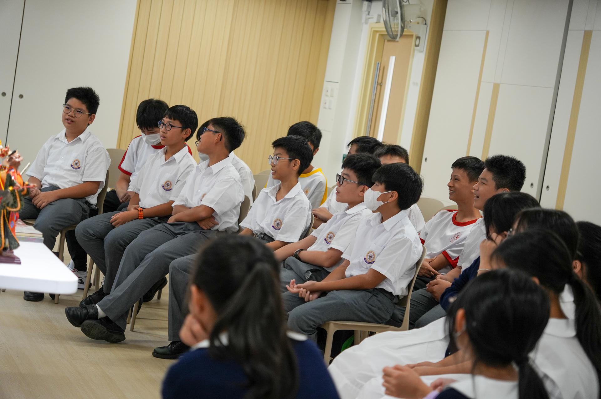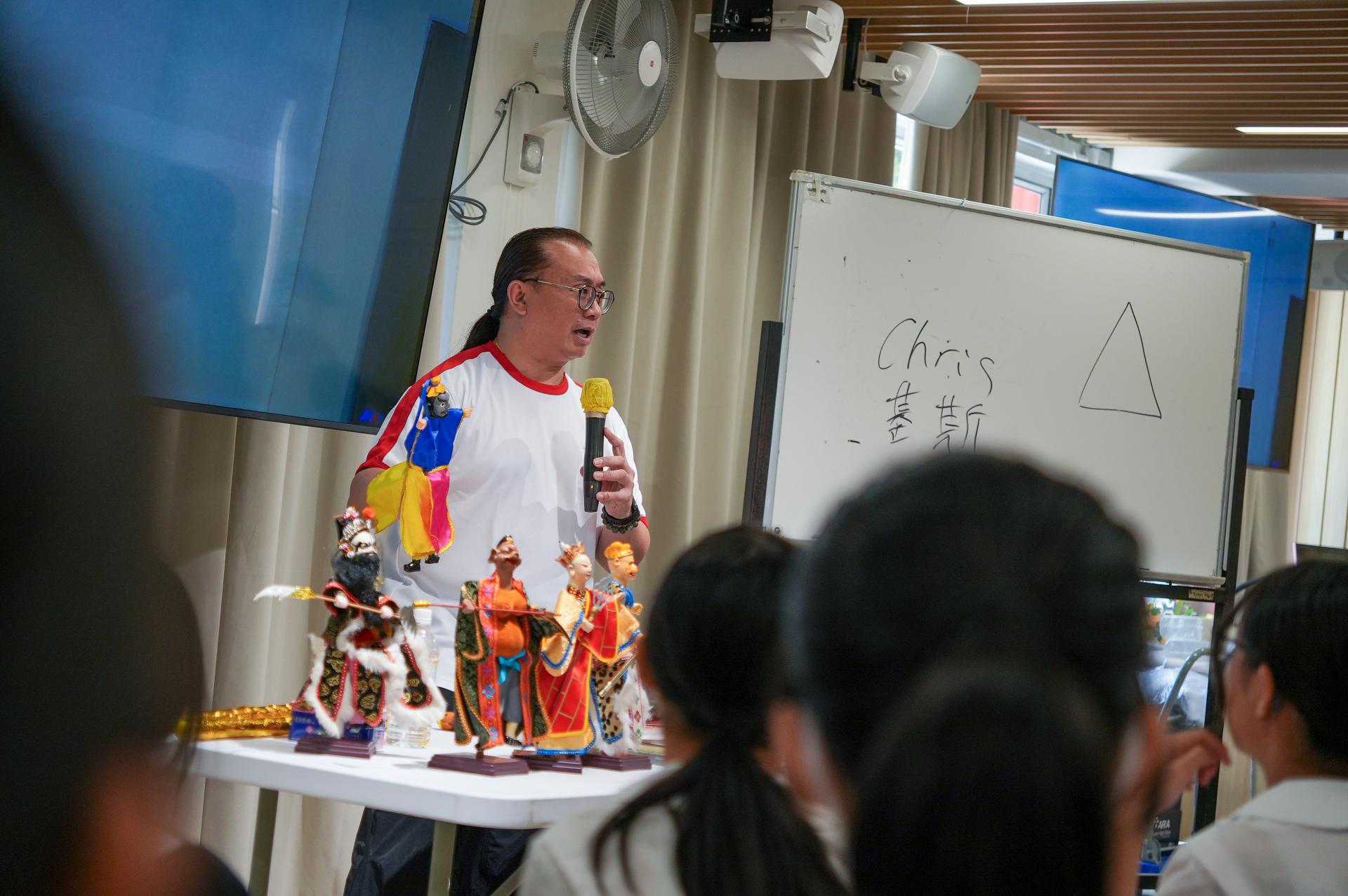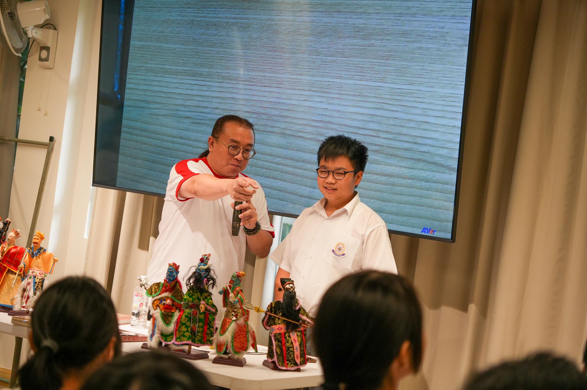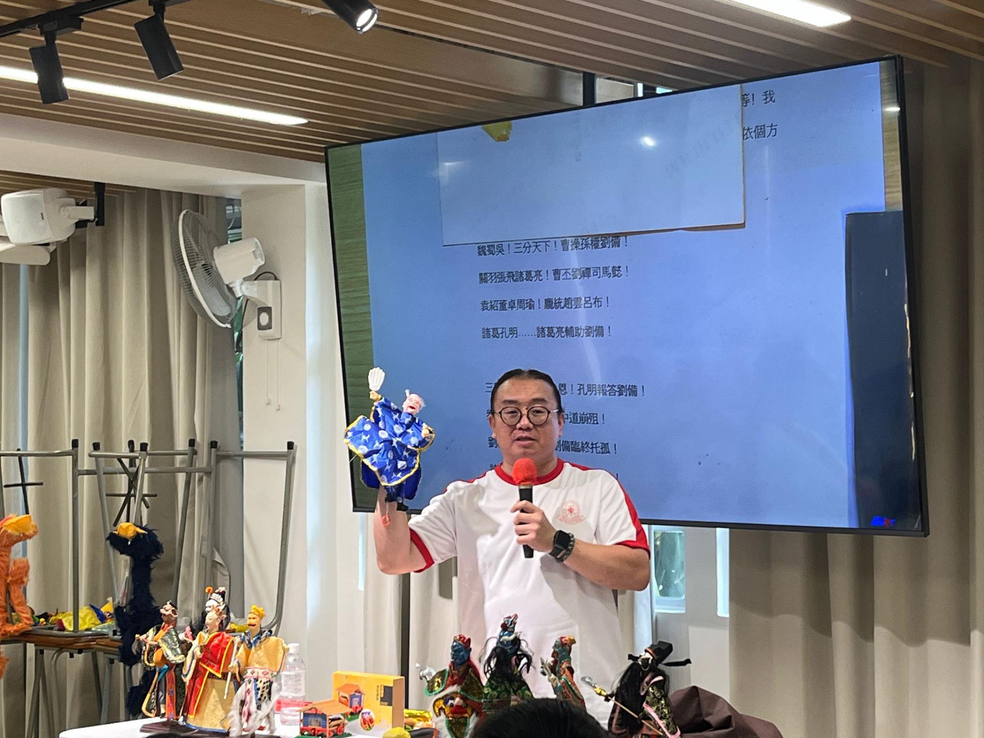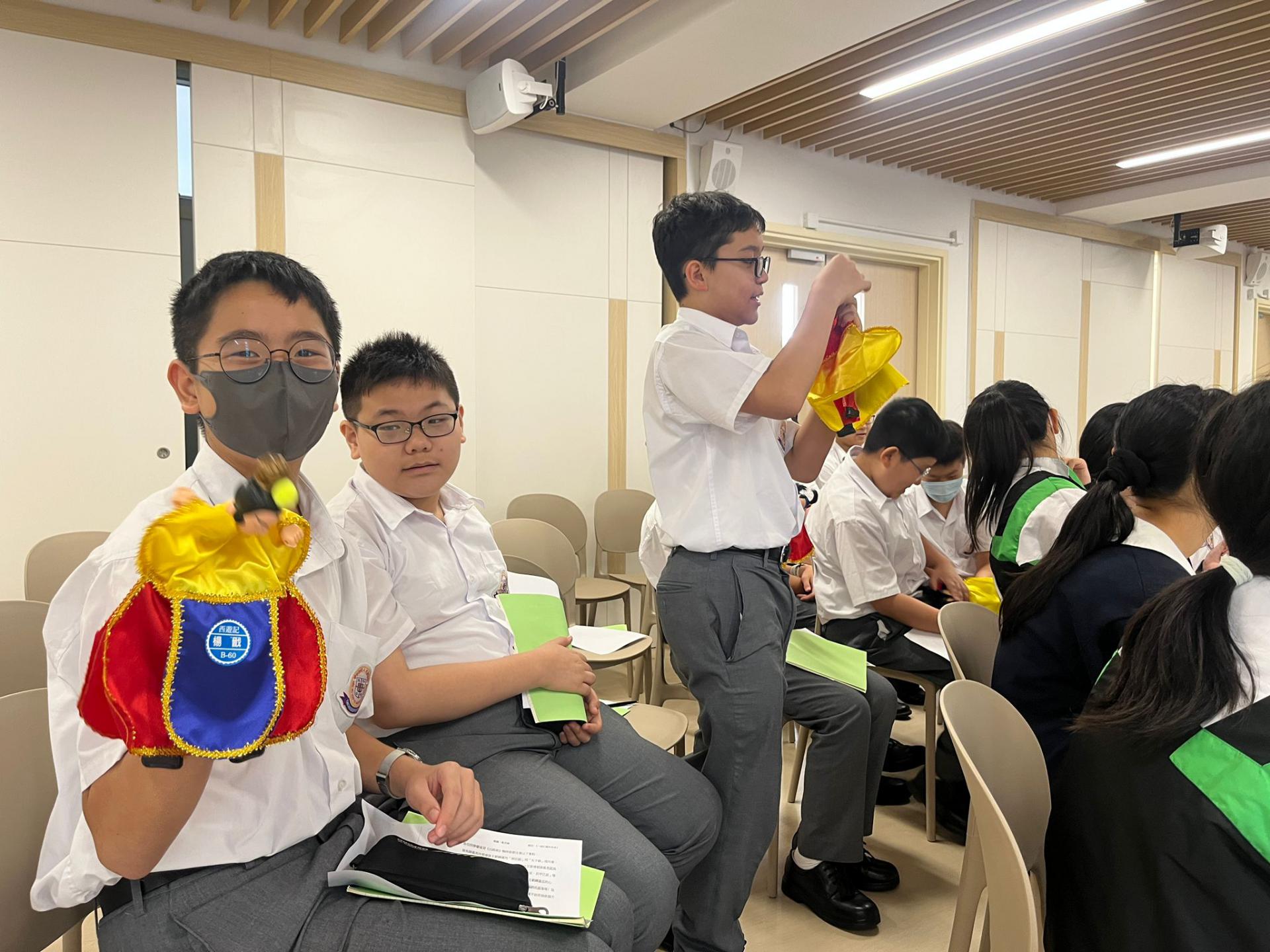 本校家長校董及家長教師會執委陳兆聰先生於9月26日蒞臨本校,與中文科及圖書館合辦「布袋木偶*劇藝課節」,以封神演義、三國演義及西遊記等布袋偶作為引子,藉著互動教育形式,引導同學從時,地,人,事中攝取學習重點及特點,增進吸收知識的效應。 為提高同學學習動機、鼓勵同學自主學習、並增加同學認識傳統文化的機會,陳先生運用表演藝術(肢體/語言表達)、心理學/行為學(內省心理測驗/人物言行分析)、音樂(聲音感觀)、語言智能(語文/語言形象化)及視覺藝術(觀察及,圖像/臉譜所表達的內在含意)等範疇,讓同學感受另一種學習體驗。同學都熱烈投入課堂,積極運用肢體動作、語言等表達所思所想。