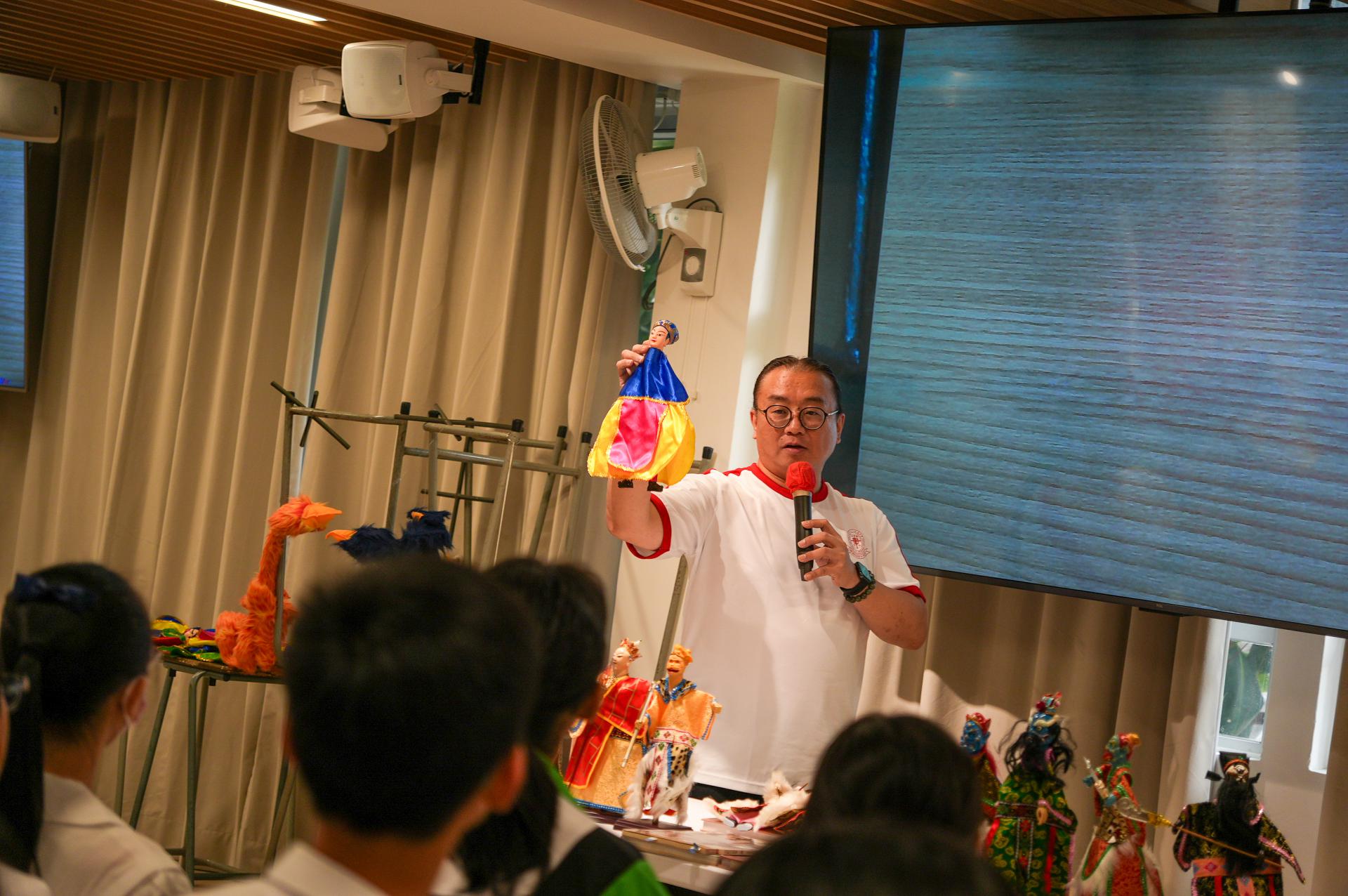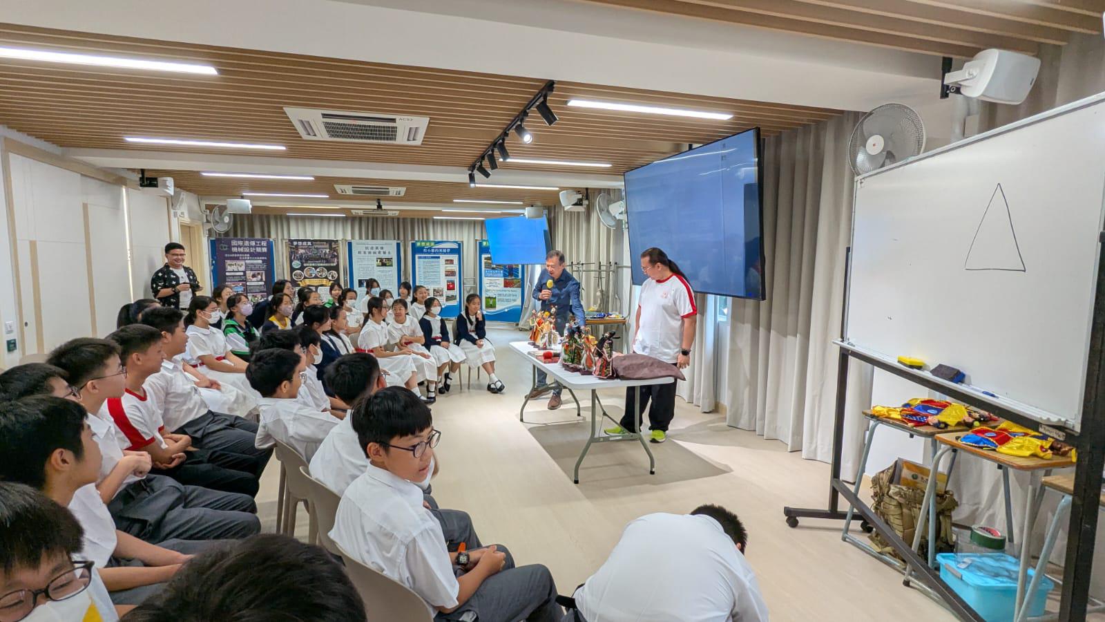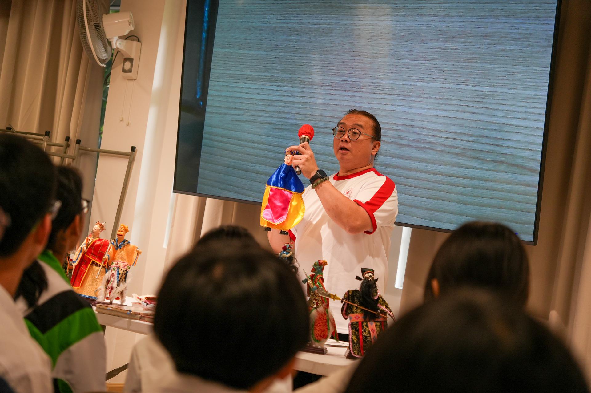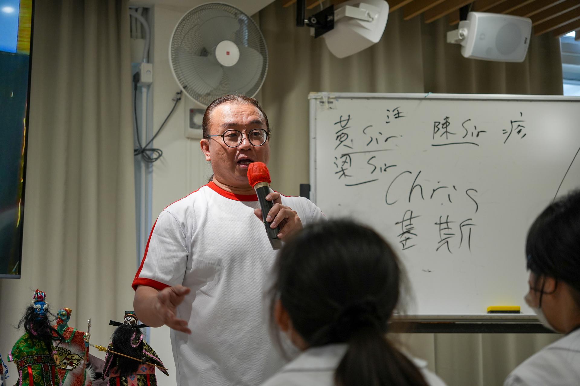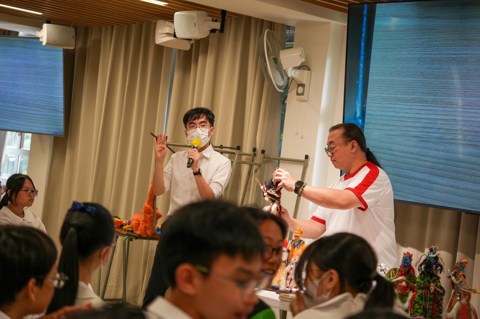 本校家長校董及家長教師會執委陳兆聰先生於9月26日蒞臨本校,與中文科及圖書館合辦「布袋木偶*劇藝課節」,以封神演義、三國演義及西遊記等布袋偶作為引子,藉著互動教育形式,引導同學從時,地,人,事中攝取學習重點及特點,增進吸收知識的效應。 為提高同學學習動機、鼓勵同學自主學習、並增加同學認識傳統文化的機會,陳先生運用表演藝術(肢體/語言表達)、心理學/行為學(內省心理測驗/人物言行分析)、音樂(聲音感觀)、語言智能(語文/語言形象化)及視覺藝術(觀察及,圖像/臉譜所表達的內在含意)等範疇,讓同學感受另一種學習體驗。同學都熱烈投入課堂,積極運用肢體動作、語言等表達所思所想。